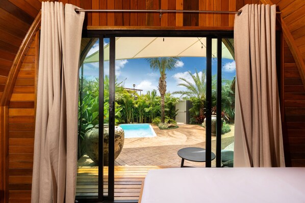 Yes, this villa features a private plunge pool and a patio.